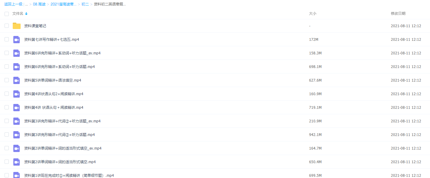 此课件来自高途课堂,2021高途课堂-王冰初二英语寒假班视频课程 ,包含视频课程和讲义资料 。 此课件主要内容包括: 写作精讲+七选五、完形精讲+系动词+听力话题、单词精讲+语法填空、状语从句+阅读精讲、完形精讲+代词②+听力话题、单词精讲+词的适当形式填空、现在完成时①+阅读精讲(简单细节题)等视频
