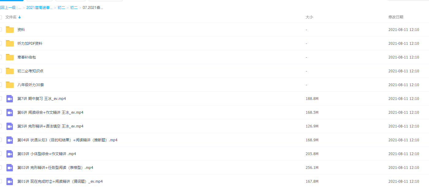 此课件来自高途课堂,高途课堂-王冰初二英语2021年春季班视频课程 ,包含视频课程和讲义资料 。 此课件主要内容包括: 阅读综合+作文精讲、完形精讲+语法填空、状语从句3(目的和结果)+阅读精讲(推断题)、小体型综合+作文精讲、完形精讲+任务型阅读(表格型)和现在完成时②+阅读精讲(猜词题) 等视频