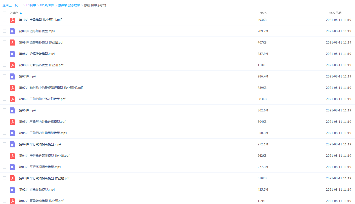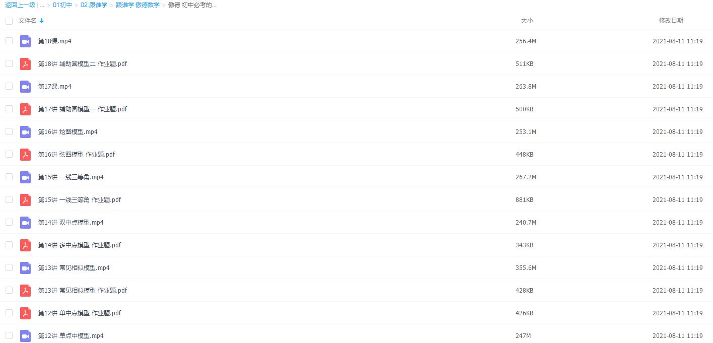 此课件来自有道精品课,傲德数学初中必考的18种几何模型,包含视频课程和讲义资料。此课件主要知识点包括:半角模型 、风吹树倒模型、单点中模型、常见相似模型、多中点模型 、 双中点模型、 弦图模型、辅助圆模型、直角转动模型、 平行线间拐点模型、三角形内外角甲酸模型、轴对称中的最短路径模型、 分解旋转模型、边等角补模型等模型