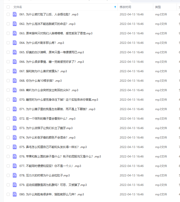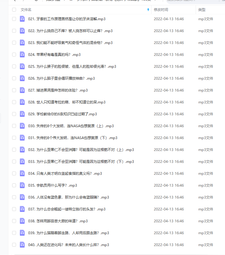 少儿科学启蒙有声读物《把科学带回家》MP3音频,共100集。 声明:本站资源来自会员发布以及互联网公开收集,不代表本站立场,仅限学习交流使用,请遵循相关法律法规,请在下载后24小时内删除。 如有侵权争议、不妥之处请联系本站删除处理! 请用户仔细辨认内容的真实性,避免上当受骗!