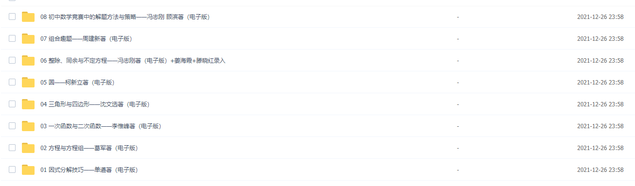 此课件来自初中数学小蓝本PDF电子文档可打印课程,此课件包含:因式分解技巧——单遵著(电子版)、方程与方程组——葛军著(电子版)、—次函数与二次函数——李惟峰著(电子版)、三角形与四边形——沈文选菩(电子版)、圆——柯新立著(电子版)、整除、同余与不定方程——冯志刚著(电子版)+姜海霞+滕晓红录入、组合趣题——周建新著(电子版)、初中数学竞赛中的解题方法与策略——冯志刚顾滨著(电子版)。