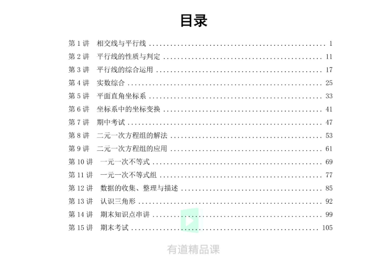 此课件来自有道精品课,曹笑初一数学春季提升班视频课程完结。此课件主要知识点包括:相交线与平行线、平行线的性质与判定、平行线的综合运用、实数综合、平面直角坐标系、坐标系中的坐标变换、期中考试、二元一次方程组的解法、二元一次方程组的应用、一元一次不等式、一元一次不等式组、数据的收集、整理与描述认识三角形。