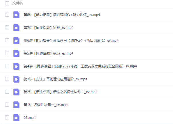 此课件来自高途课堂网校,王赞2022寒假高一英语寒假系统班8讲完结。此课件主要知识点包括:语法之名词性从句、旅游、家庭、听口训练、科技、演讲稿写作、读后续写(动作类)等等视频课程。