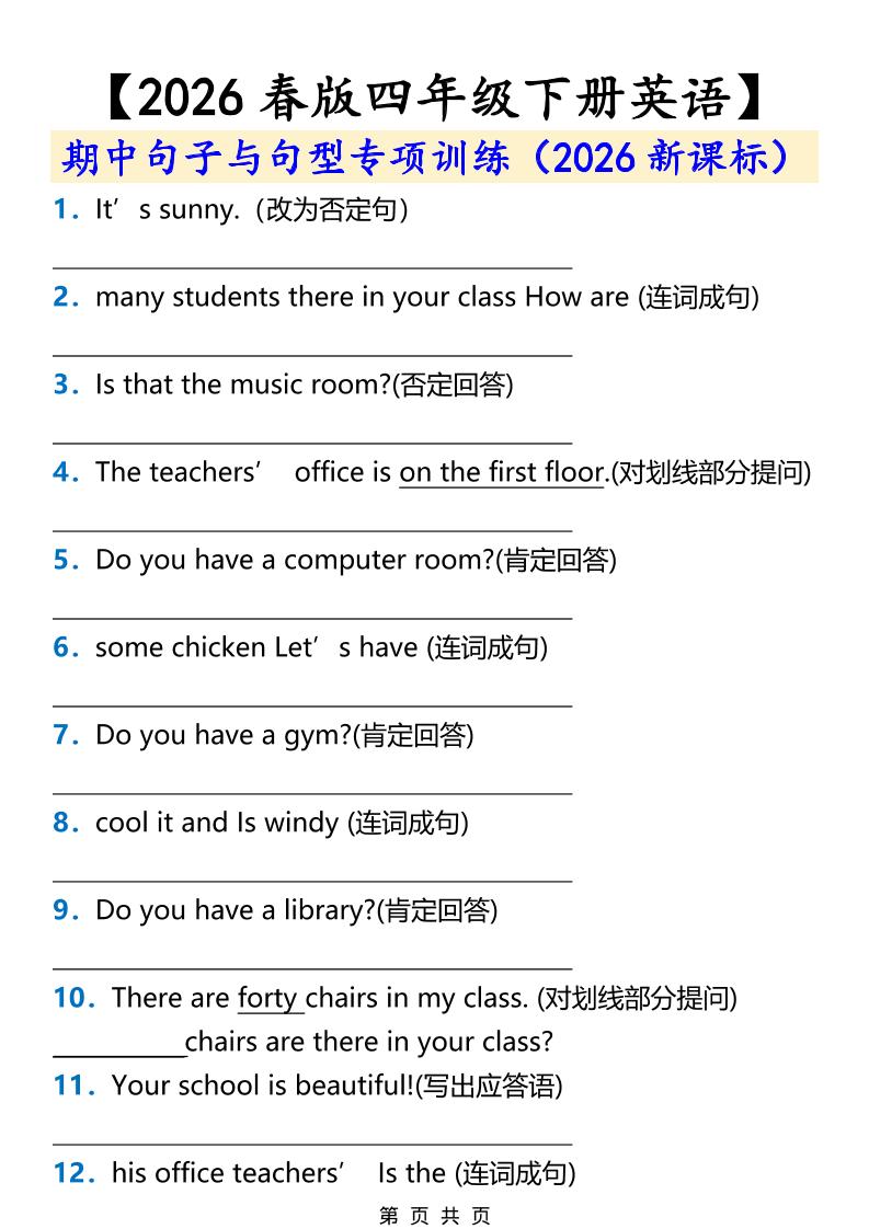 2026春新版四年级下英语期中句子与句型专项训练《人教版PEP》