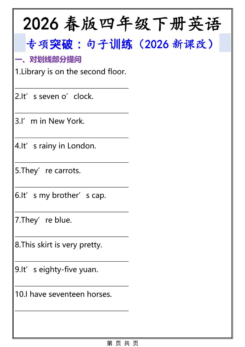2026春新版四年级下英语句子专项训练《人教版PEP》