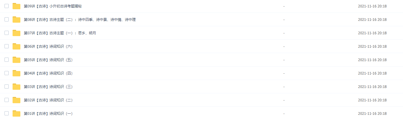 古诗词在小学语文的学习当中有着重要的地位,所以千万不可马虎大意,古诗词数量和考点也在急剧增多。因此这对孩子们的记忆能力,和逻辑思维能力有很大的要求,不然不仅理会不到作者作诗时的思想情感,更很难在考试当中取得好成绩。此课件来自小学1~6年级古诗词基础知识课视频课程全套,非常全面,孩子需要牢记,建议家长们都能替自己的孩子收藏好。
