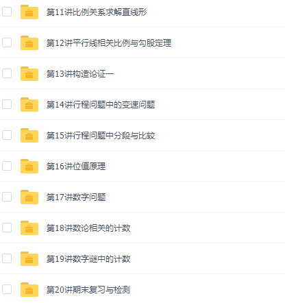 此课件来自高思网校,竞赛小学数学五年级下册知识点讲解视频课程。此课件主要知识点包括:整数数列运算、分数裂项、燕尾模型、位值原理、圆与扇形初步、余数问题、钟表问题、行程问题综合提高、水管问题、正反比例的概念与应用等等视频课程,此课件旨在培养学生分析问题和解决问题的能力,提升学生综合的数学素养。